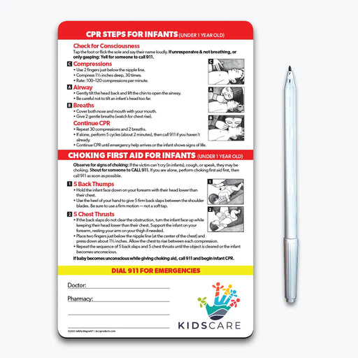 This invaluable laminated card shows how to administer Infant CPR and choking first aid. It also features a handy area for important phone numbers