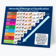 This handy science poster shows the hierarchy of biological classification (Domain, Kingdom, Phylum, Class, Order, Family, Genus, Species, and Subspecies) using the taxonomy of the dog as an example.